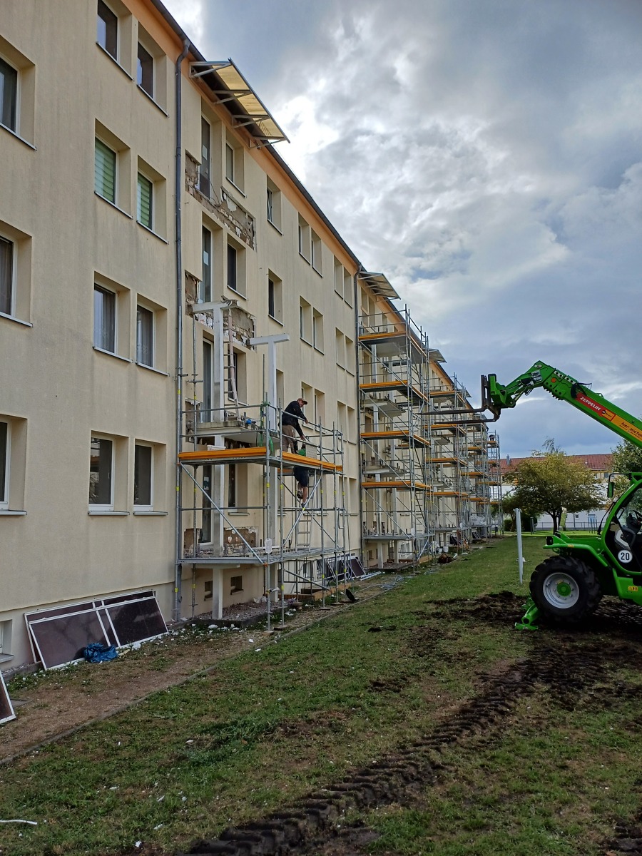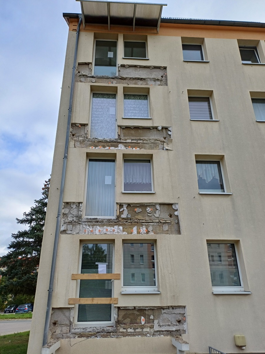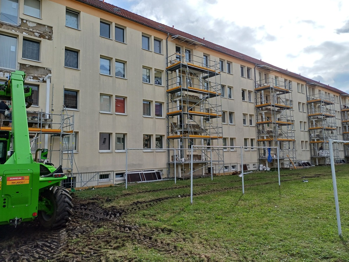 Vom 16.09. bis 06.12.2024 realisieren wir eine Investitionsmaßnahme aus unserem Wirtschaftsplan 2024: Abriss von 24 DDR-Balkonen und Montage von 48 modernen Balkonen, also an allen 48 Wohnungen.