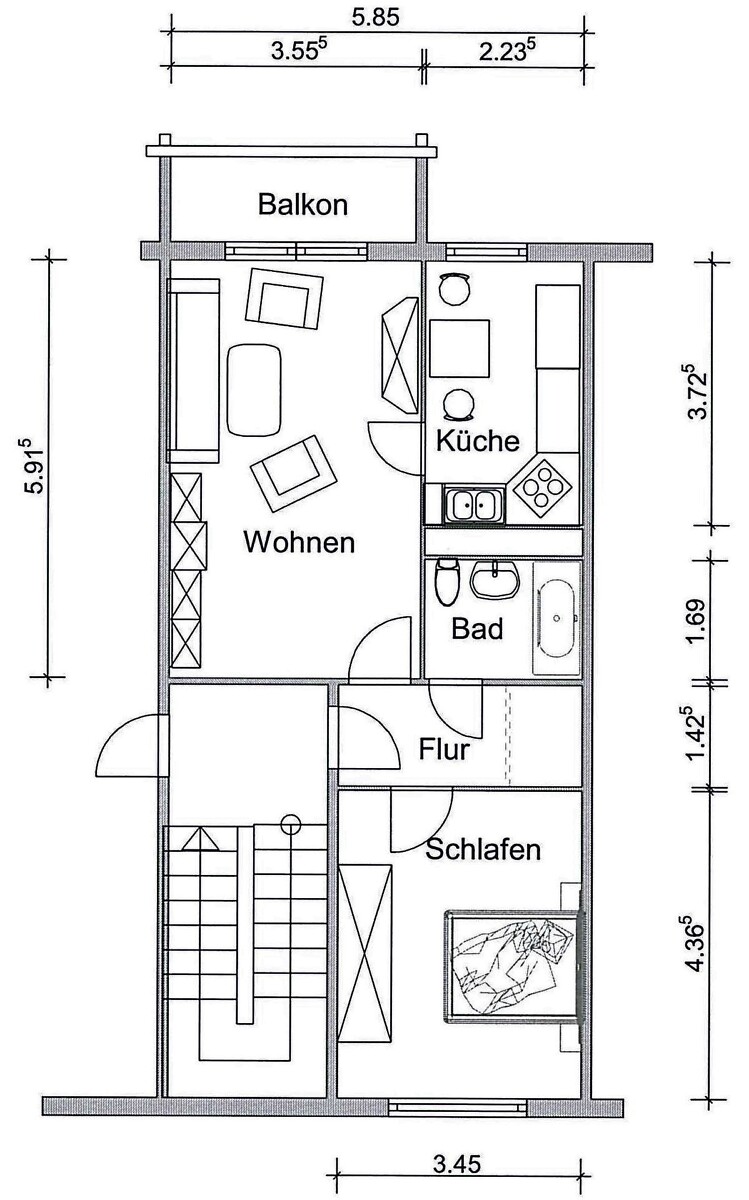 Die Zweiraumwohnung verfügt über: